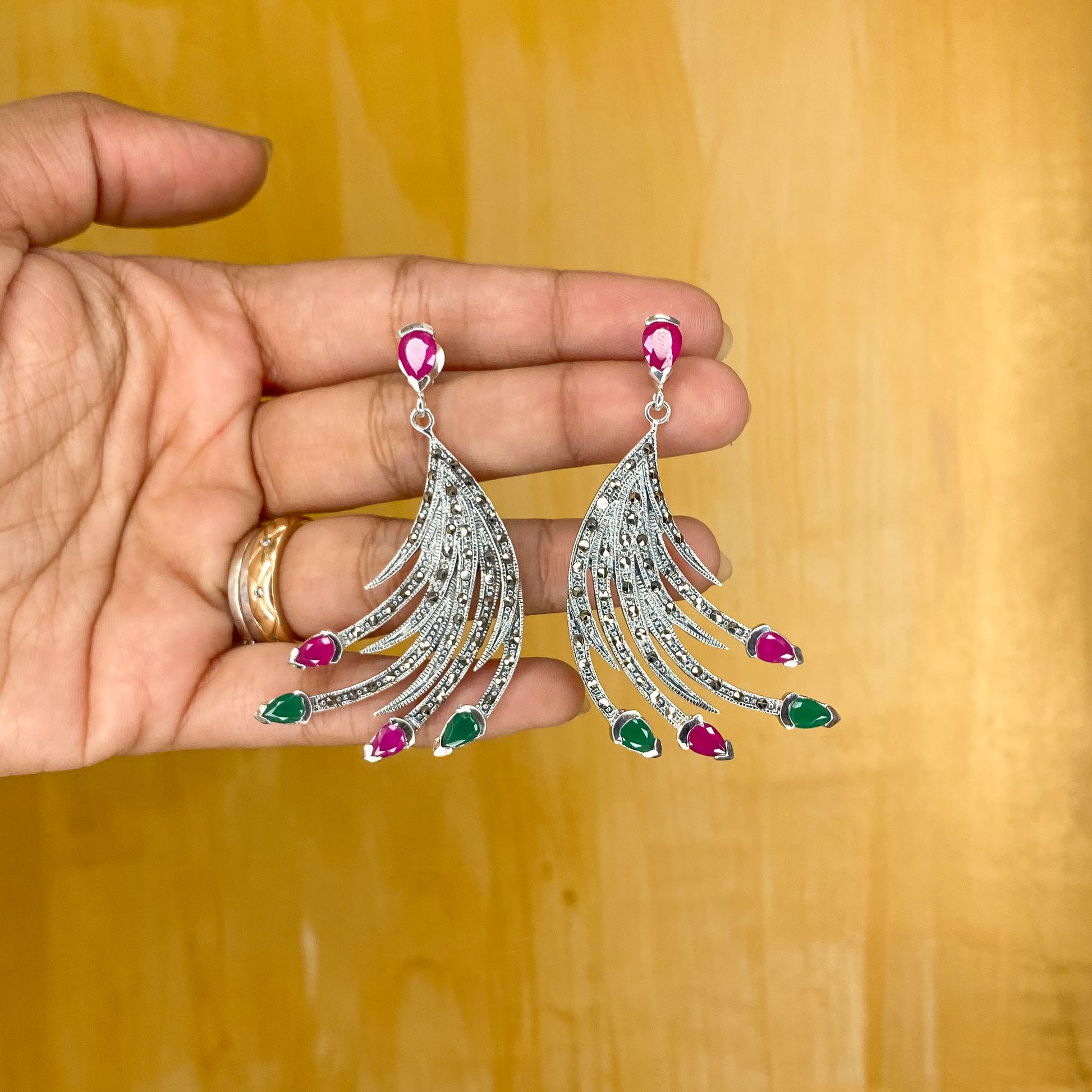 The allure of these earrings is further heightened by the radiant gemstones studded at the ends. These precious gems not only enhance the overall aesthetic but also bring a subtle sparkle to your look, catching the light with every movement. The gemstones are carefully selected for their captivating hues, adding a mystical charm that complements the silver craftsmanship.