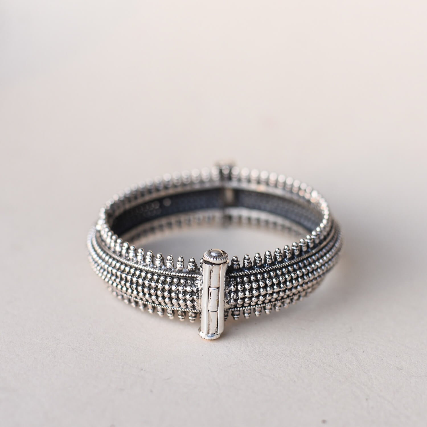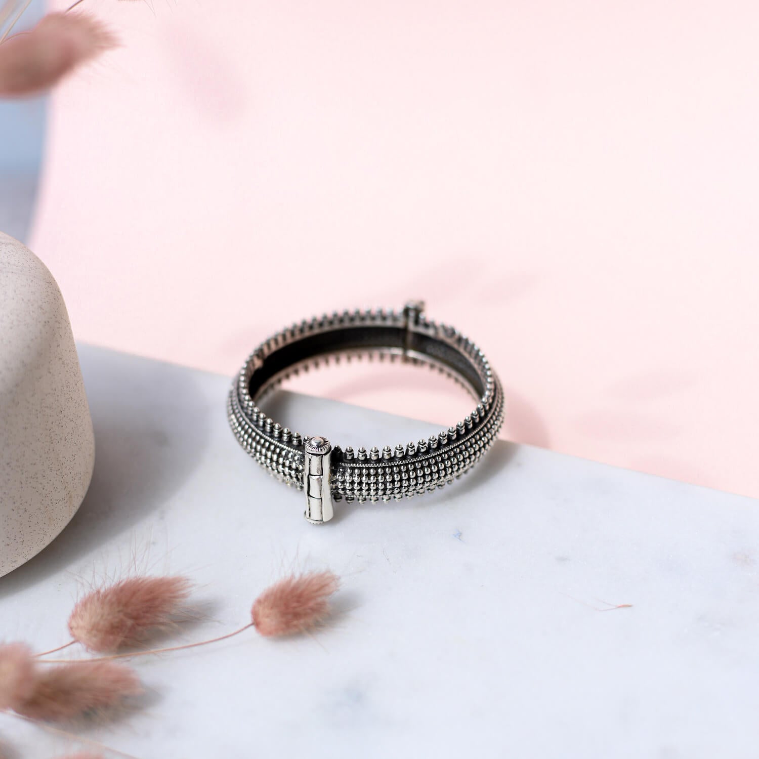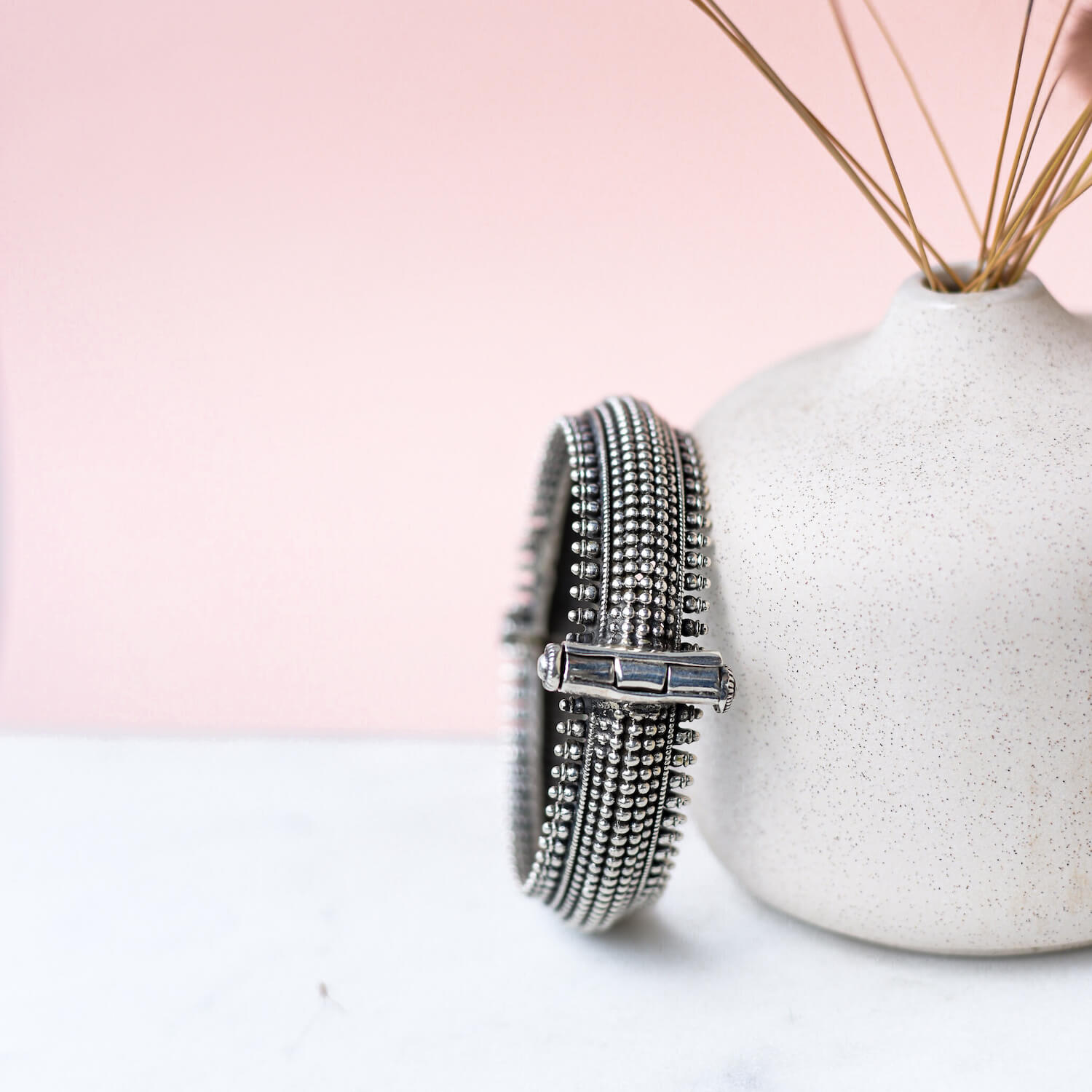 Ornate for the bohemian ensemble as well as for the any traditional outfit, carry these beautifully crafted oxidized handmade kadas with rava in pure 92.5 silver work to make heads turn.